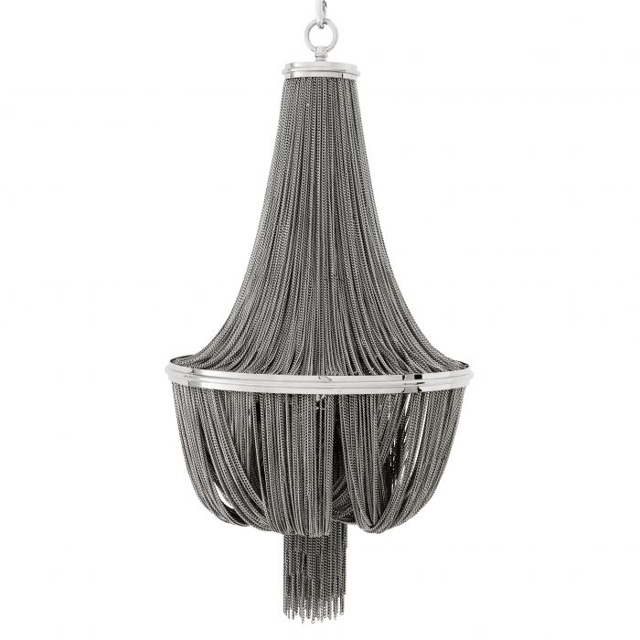 Add splendour and luxury to your interior with the enthralling Martinez L Chandelier. A perfect marriage of Empire style and Boudoir chic. This beautiful basket chandelier with nickel finish features a decorative metal chain surround that conceals the light source adding reflected sparkle.